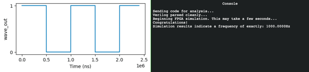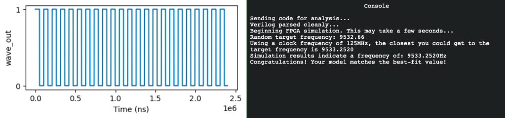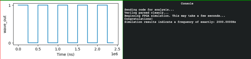 In order to make this Verilog program, I adapted the one described at https://numato.com/kb/generating-square-wave-using-fpga/ to the clock frequency of the hardware used in this challenge which it 125Mhz. The counter is so decremented by CLOCK_FREQUENCY/(2*freq/100) converted to integer through $rtoi method.