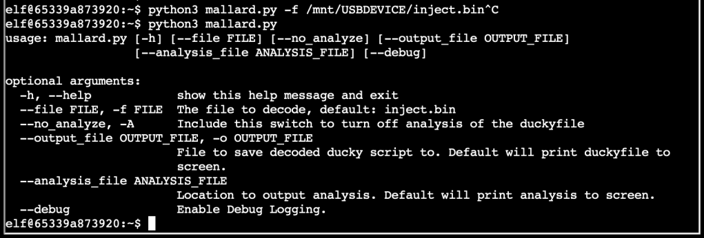The script mallard.py is present in the server, let’s have a look on what we can do with. I launch a python mallard.py -h