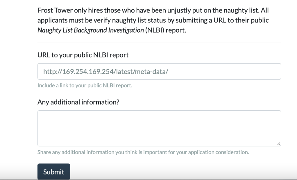 According to the hints we got from Noxious O. D’or, it will be about performing an SSRF combined with IMDS queries to get the secret token.