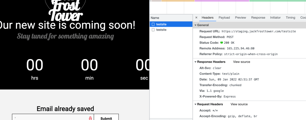 According to Chrome dev tools/network, the data is transmitted to the endpoint /testsite. Let’s have a look at it: