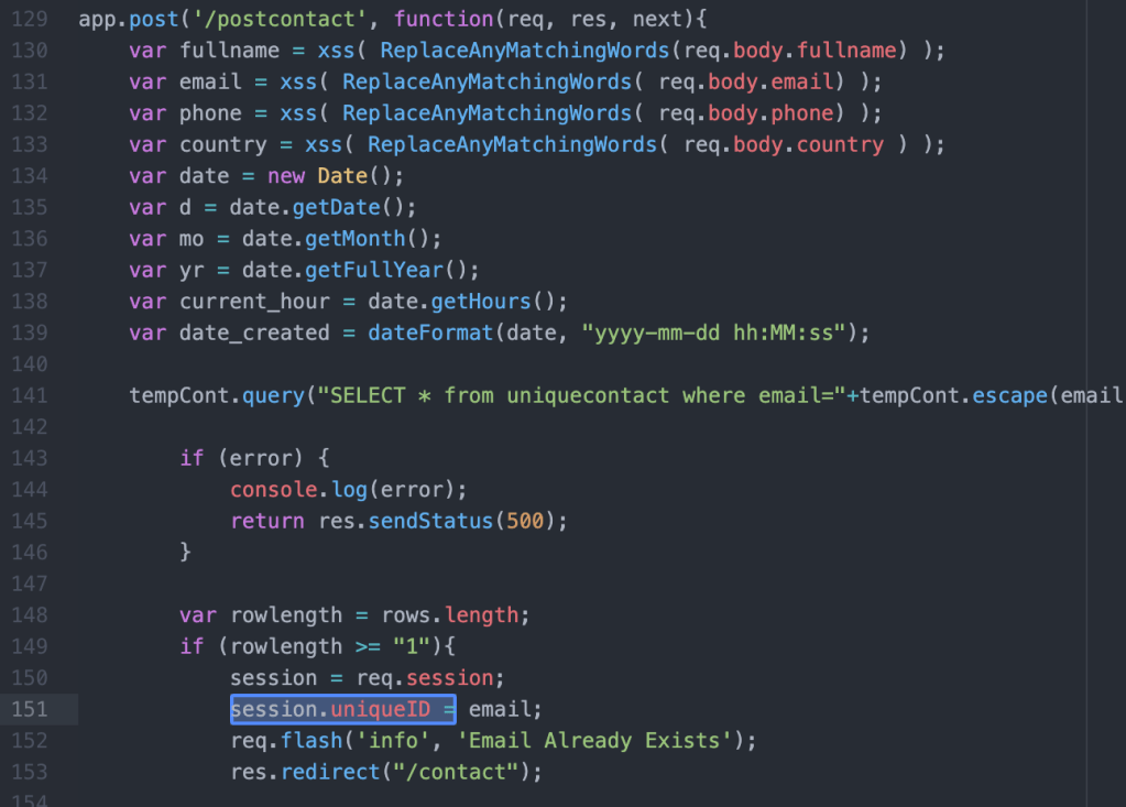 Let’s try to understand the code. So according to the route it’s about a page where a user can add his contact. An SQL query will then be executed to check if the email is in the database (141-149), if it is the case: session.uniqueID will get a value (email but not very important) and we will be able to reach /detail/ in order to make an injection.