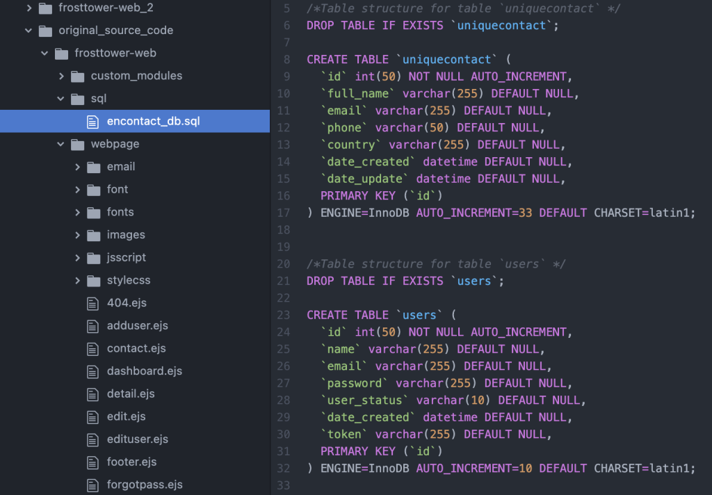 According to the source code, we understand that it’s about a NodeJS application. The files that we will potentially be interested in the most are ./server.js and ./sql/encontact_db.js.